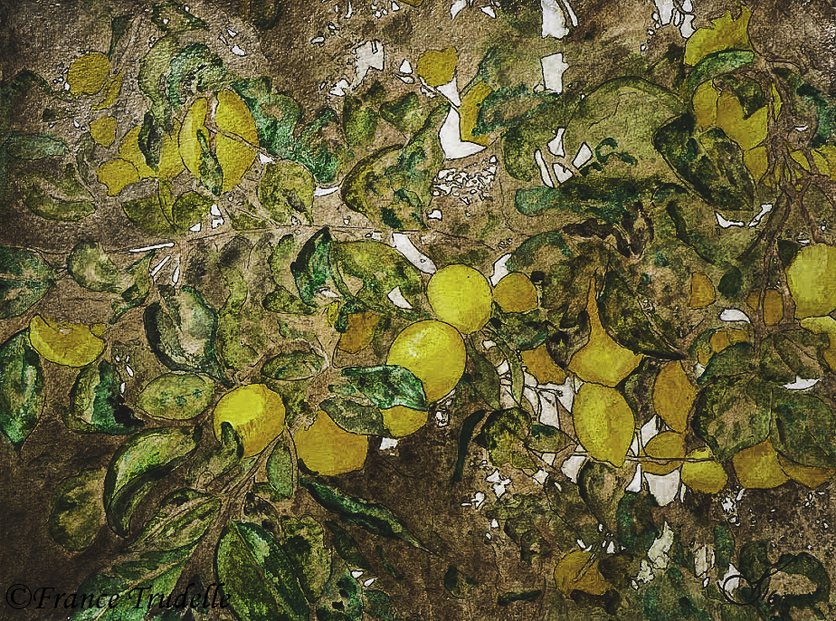 SENTIERI DEI LIMONI – , 2016, tech. mixtes sur papier artisanal amalfitain, 12″ x 15,5″ – 200 $ – Photo: André-Guy Robert